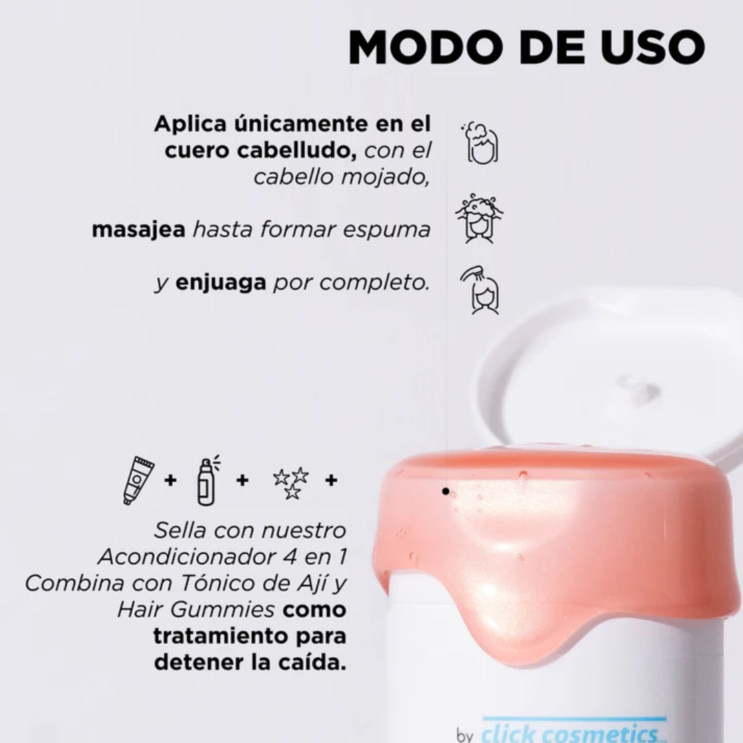 Limpia tu cabello profundamente con nuestra fórmula especializada a base de ají, limón, café y menta, diseñada para estimular la circulación en el cuero cabelludo y fortalecer desde la raíz.